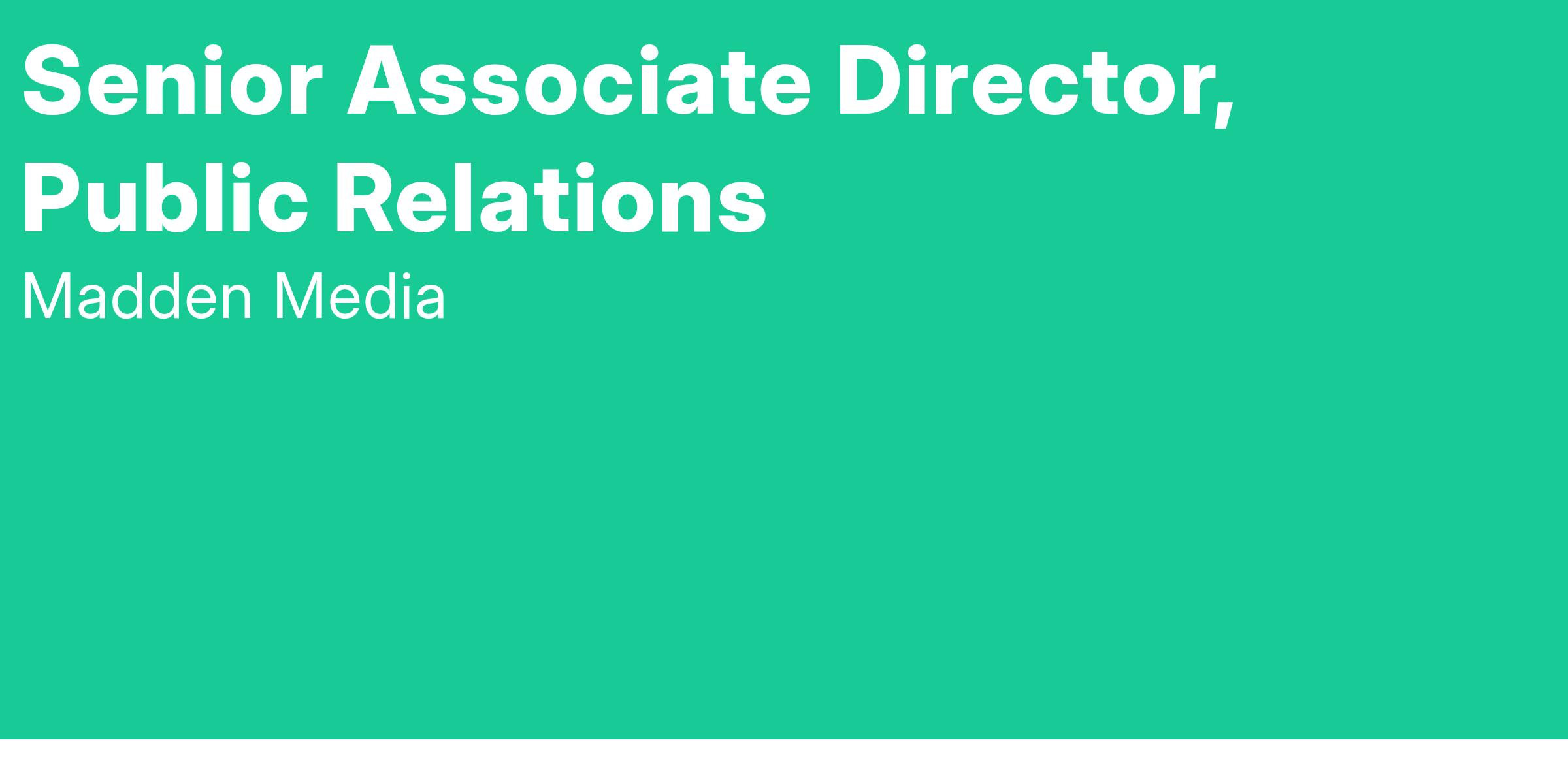 You are effective in communicating both internally and externally and are confident in representing Madden in the destination marketing and public relations industry. You're excited about joining a team who support each other and you are a confident manager in helping the team learn and grow. You are eager to contribute your unique talents in a collaborative effort to bring our team to new levels of collaboration and productivity. Most importantly, you stand ready to contribute and grow in a dynamic environment where every day brings new opportunities and challenges. As important as it is to develop the strategy, your best work will come when you inspire, empower and enable the team to deliver it.